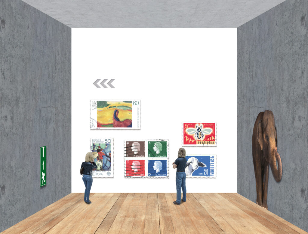 Hier zeigt sich die Farbtreue der Endoskop-Kamera. Als kleine Aufgabe an die Messe-Besuchenden geht es darum zwischen den Museumsinhalten – Briefmarken – eine kleine Maus zu finden.