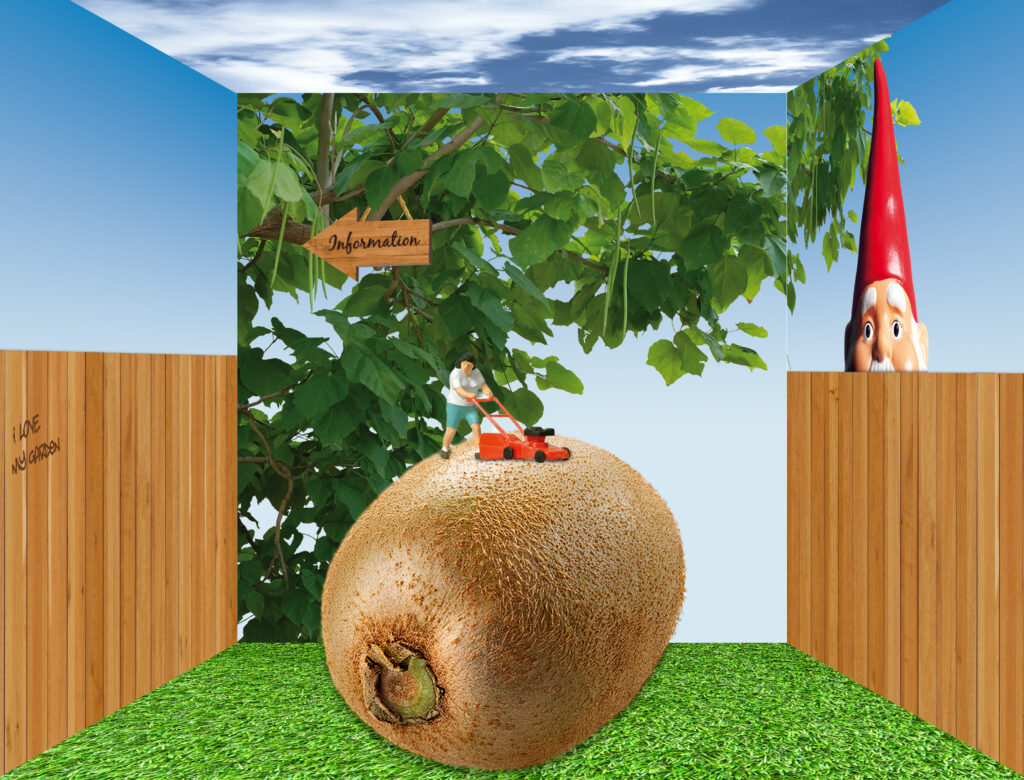 Im Garten geht es auf die Suche nach einem Vogel, hierbei zeigt sich die volle Flexibilität der Kamera. Ablenkung bei der Suche entstehen vielleicht durch den Kiwi-Rasenmäher und den großen Gartenzwerg, der über den Zaun linst.